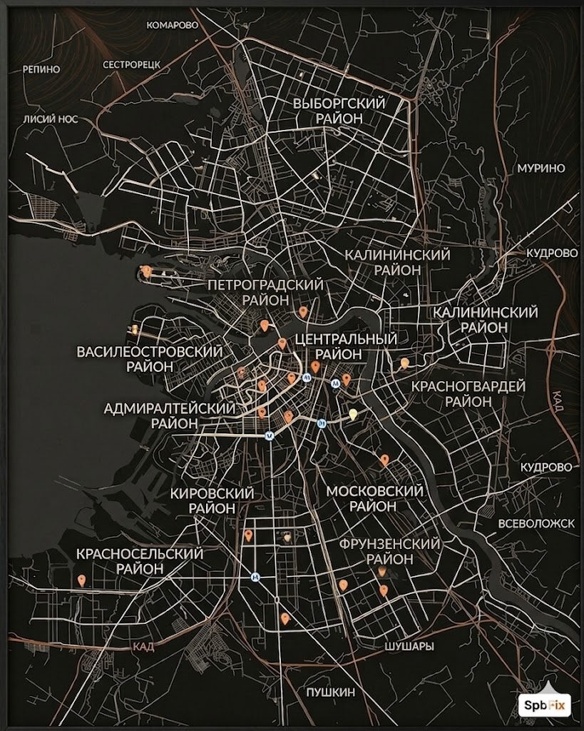 Мы оптимизировали логистику, чтобы мастер SpbFix был у вас максимально быстро. Наша карта покрытия разделена на две удобные зоны: